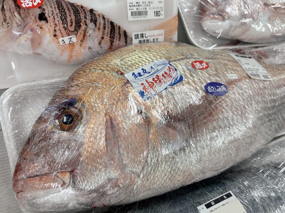 【本日入荷の鮮魚】真鯛、サワラ、スズキ、カレイ、ミノカサゴ、よこわ、牡蠣、数の子、あかもく、干物 など