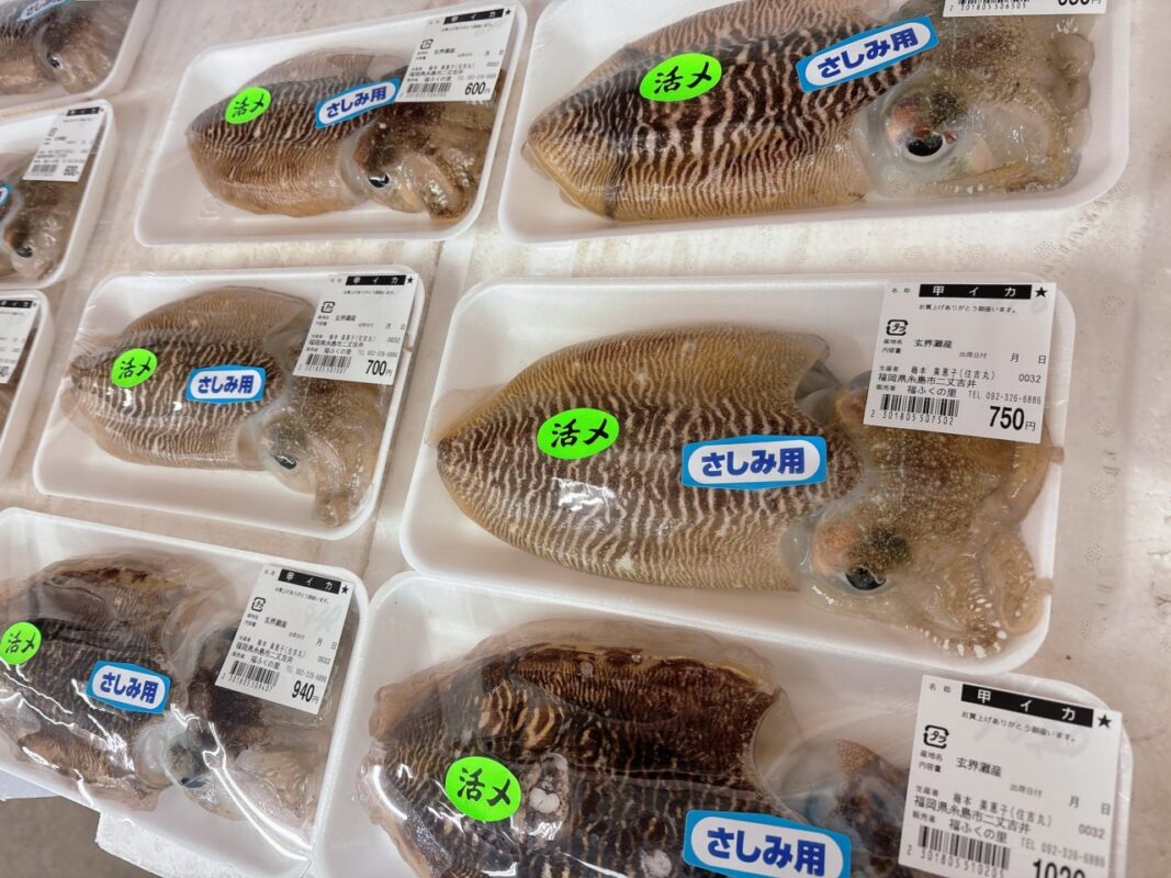 【本日の鮮魚】コウイカ、マダコ、車海老、オコゼ、マゴチ、ひらめ、真鯛、真アジ、青アジ、養殖茎わかめ、養殖めかぶ、チヌ、カニ、干物各種、冷凍あかもく など